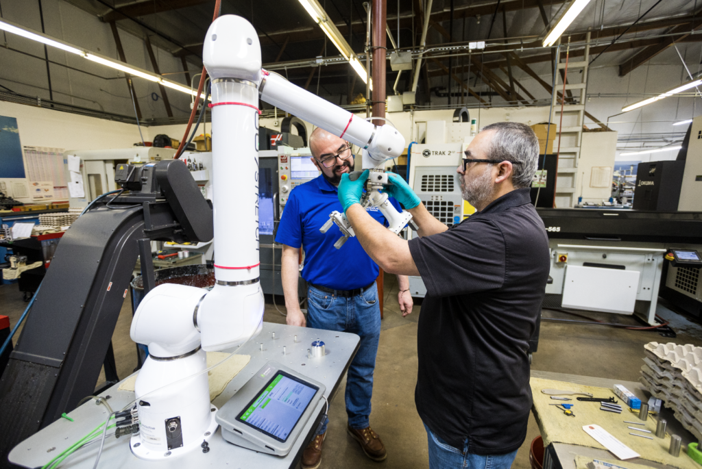 The OB7 is a 7-axis robotic arm and comes with various payload options and reach. Cal-Draulics opted for the OB7 Stretch model since their parts are small and having a longer extension would add versatility. After a three-hour drive to Carpentaria, it took only five minutes to train Jose and Johnny on the Productive Robotics OB7 cobot system through their simple and intuitive drag and drop interface. “Teaching us to use the cobot was simple and fast,” details Jose. “It learns by doing. You move the arm where you want it to go, and it creates the path. Want to set a way point? Click a button. Set your arm travel to avoid possible obstacles by physically moving the head in the direction you want it to go, and it remembers, and is repeatable. Open the jaws, set. Close the jaws, set. Move to this position, set. It is as simple as activating the learn mode on the handheld controller and away you go. It is so fast and easy to setup that we don’t even bother saving most operations because it is just faster to reprogram. If we move it to another machine all it takes is position it, set the feet, and program. My son, Aaron was 12 years old when he came with me to work after judo practice. He is in all white and I told him don’t get dirty or your mom will kill me. He has no experience doing anything but playing video games and being a kid. He knew I was excited about getting a robot, so he was interested in how it worked. Five minutes later and still perfectly clean he trained OB1 to open the door, close the door, place the part on the table, and pick it back. He told me It’s so user friendly I will train you to do it too.”