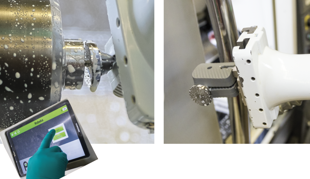 The OB7 cobot is programmed by doing. It learns by going through the desired motions. It begins its cycle by opening the door, wiggling the part to break it off, then closes the door while still holding the part.