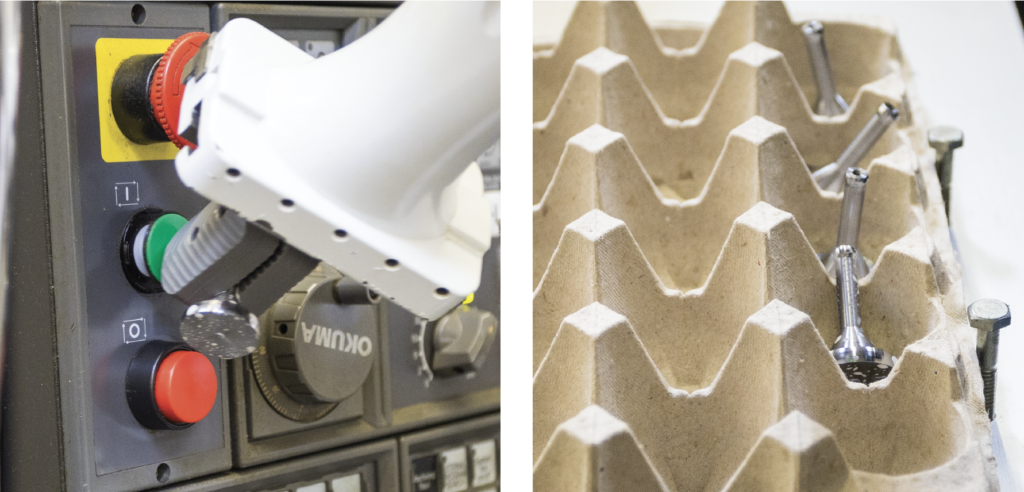 Once the door is closed the machine is restarted by pressing the button. The parts are then dropped or placed into a grid system on the table. The process is then repeated. Each cobot delivers a fully unmanned shift 6 days a week.