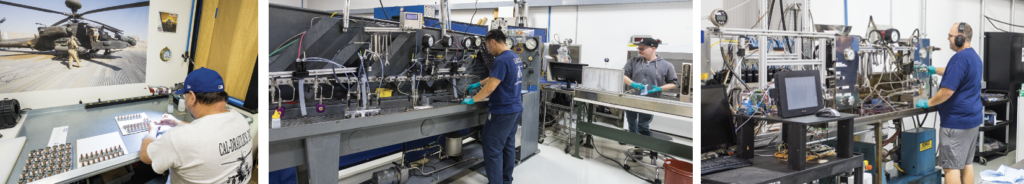 Manufacture, assemble and test is the Cal-Draulics way. Left Robbie meticulously assembles a disposable sensor for the Cobra helicopter. Right – Since our last visit all the fluid testing has been relocated to the second building. Here they test a variety of fluids, the most common being MIL- PRF -5606 red oil and Skydrol hydraulic fluid. Every assembly that leaves Cal-Draulics has been 100% tested.