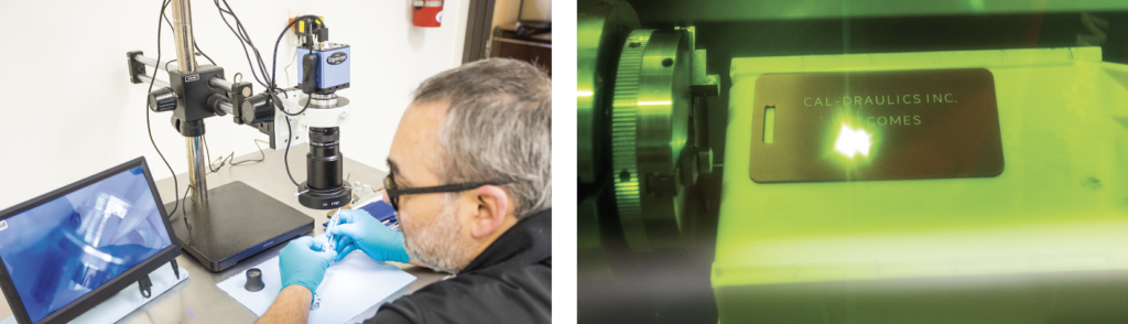 Left – Deburring is an important part of the manufacturing process at Cal-Draulics. Being able to view a part close up is key to removing any burs. They just picked up a 40x vision system from Quality Control Solutions of Temecula, CA. to assist in the process. Right – Beamer Laser engraver is brand new. They just got trained on it yesterday. The new laser is 100 times faster than their old system and made in the USA. They got it primarily for a landing gear assembly, but it has endless possibilities.