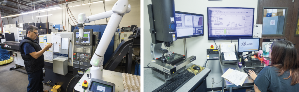 Left – OB1 waits in ready as the first article is being completed. On this run he will stop every five parts and alert the operator to check a specific feature before continuing. Right – Liz Martinez was a student in Corona High’s STEM Academy. She credits Mr. Lee and the fourth year engineering project for giving her a skill set that she uses every day in the QC lab.
