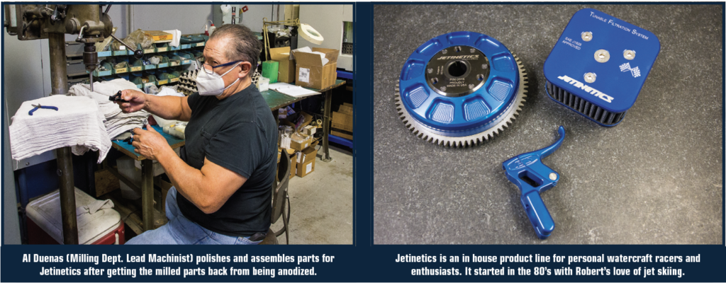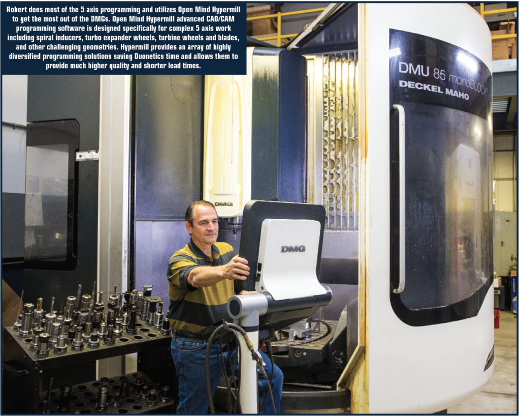 Duonetics Corporation operates “lean & mean” with 7500sq.ft. of manufacturing space at their disposal. Five full time employees split duties between the mills, lathes, balancing, programming and QC. Everyone is cross trained, giving the company an agility rarely seen in shops this size. “We are very well equipped and highly maneuverable,” touts Robert. “The diversity of our equipment gives us nimbleness and adaptability to tackle nearly anything. We have everything from the basic saw up to the most sophisticated 5 axis machining equipment money can buy, a DMG Mori DMU85. We have turning centers with live tooling and Y axis, 3, 4 and 5 axis milling machines. Our machines are larger than most shops of our size. We can pretty much handle anything you throw at us up to about 3’ in diameter.”